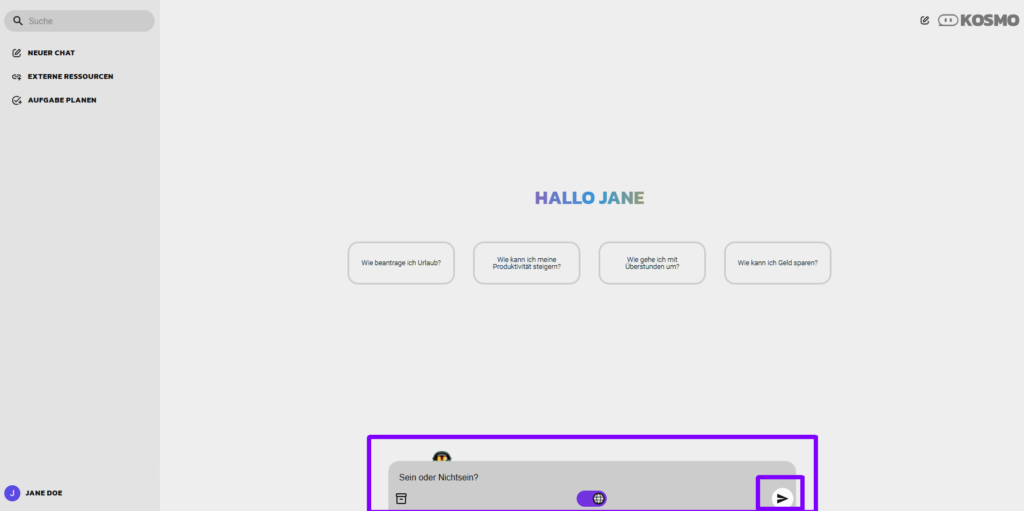 Mit einem Klick auf das Icon „Senden“ rechts neben dem Eingabefeld wird die gestellte Frage an KOSMO übermittelt.