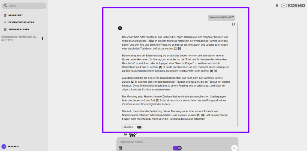 Sobald die Frage abgeschickt wurde, beginnt KOSMO, eine Antwort zu generieren. Die gestellte Frage erscheint im oberen Bildschirmbereich und die Konversation wird in Form eines Chatdialogs dargestellt.